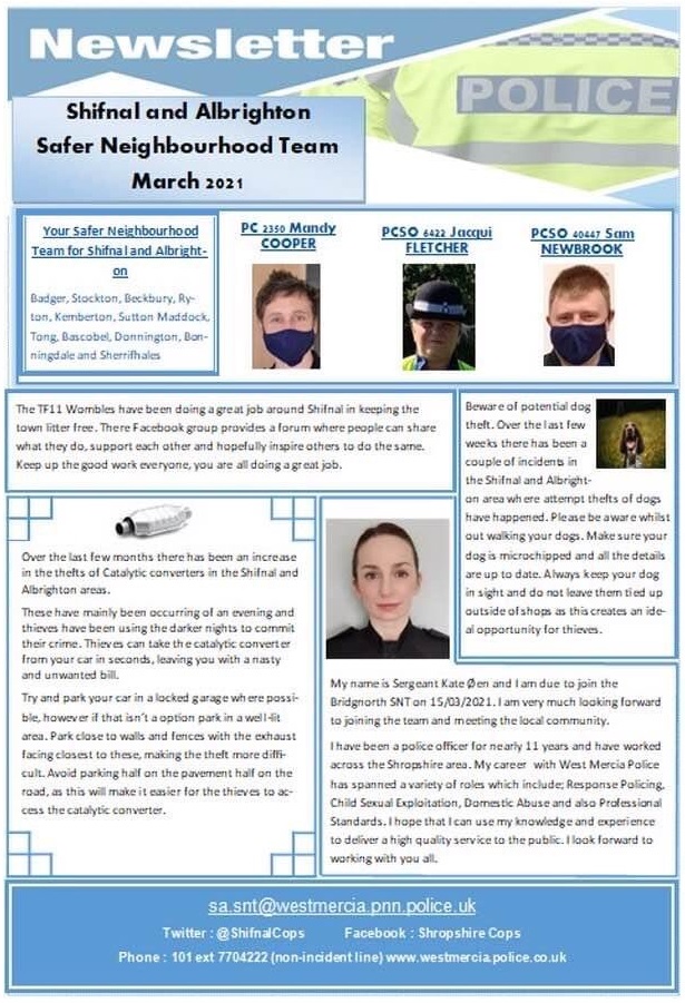 The Shifnal and Albrighton Safer Neighbourhood Team have published their March newsletter, praising the work of the TF11 Wombles who are doing a tremendous job of keeping the area tidy. I have asked Shropshire Council to ensure they pick up the bin bags for the group and I know that Jonathan has also been in touch with Cllr. Peter Nutting.