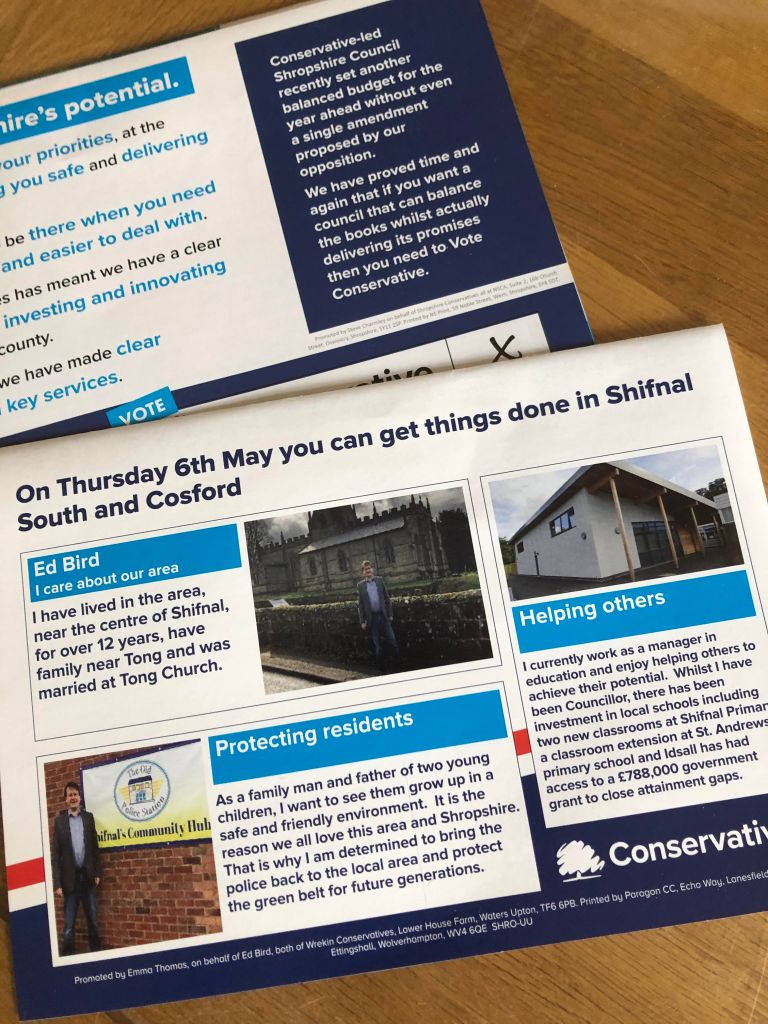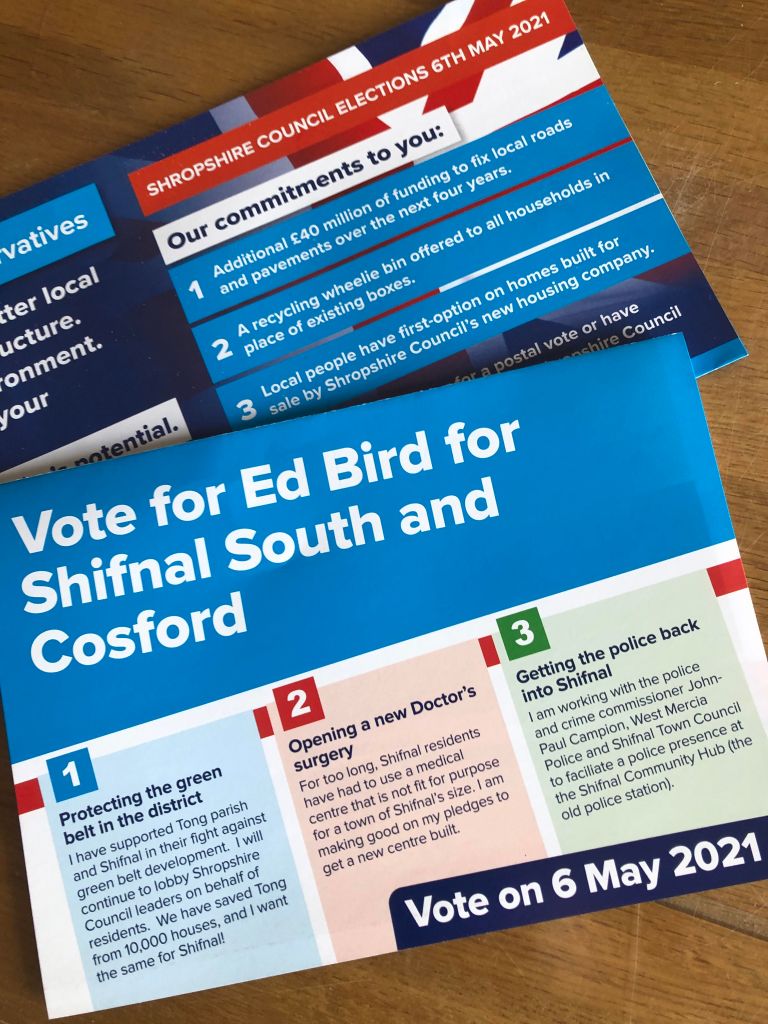Hopefully everyone in the district of Shifnal South and Cosford should have received a leaflet from me by now. If you are not sure you should get one, you can check the boundaries at https://mapit.mysociety.org/area/64039.html