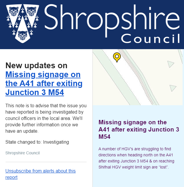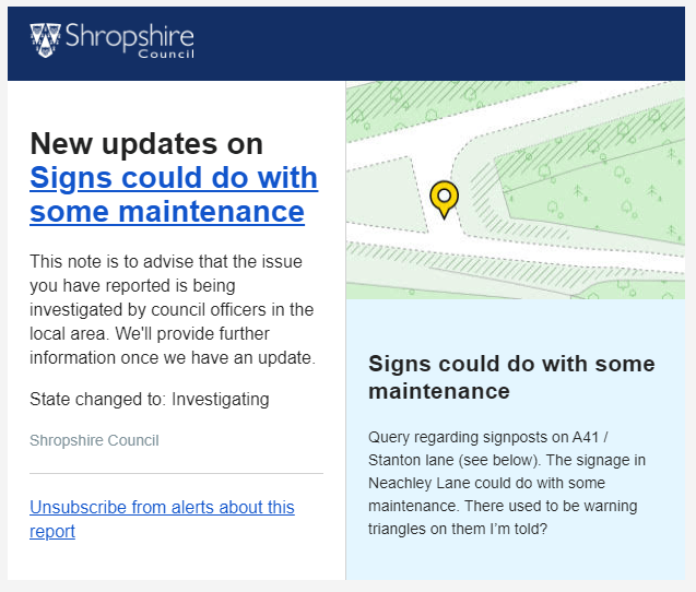 Residents can use Fix My Street to report a number of issues regarding roads, signage and general maintenance to Shropshire Council.